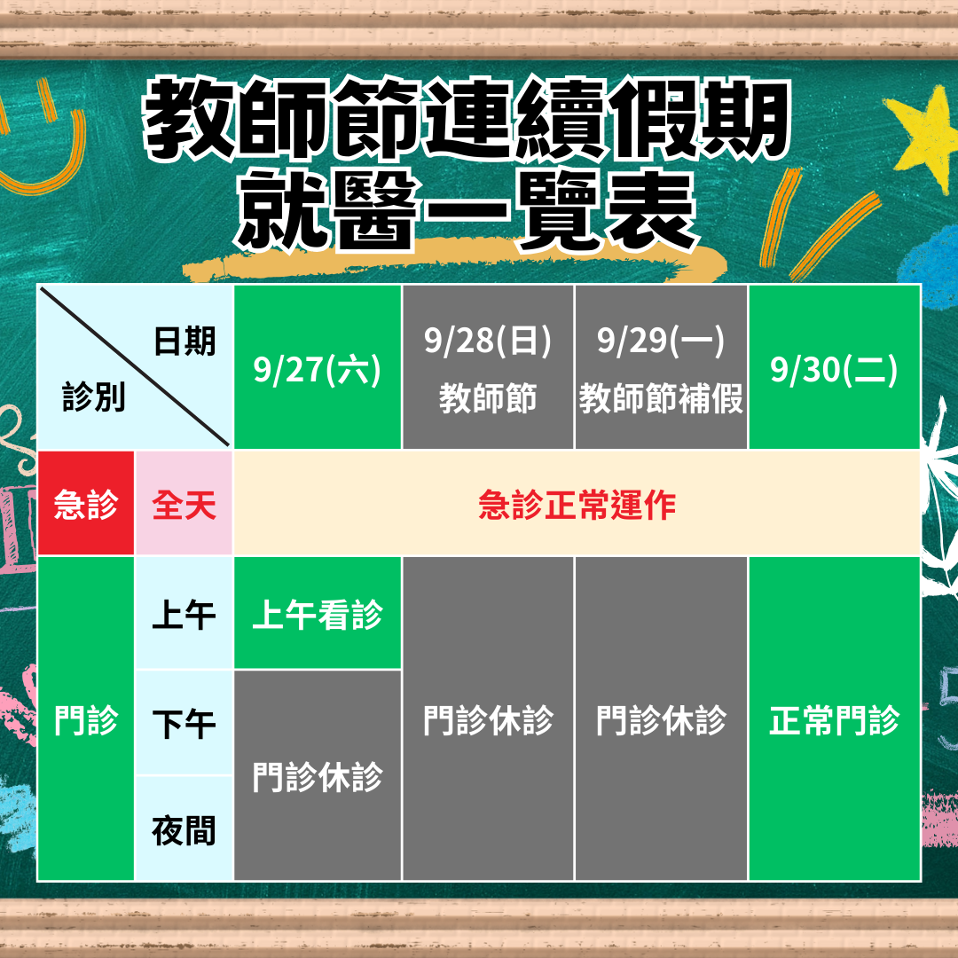 【重要公告】114年教師節連續假期醫療門診公告
