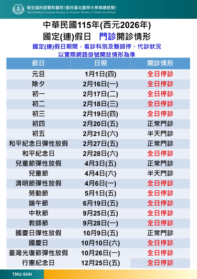 115 年(2026年)衛生福利部雙和醫院國定(連)假日門診開診情形一覽表如下: