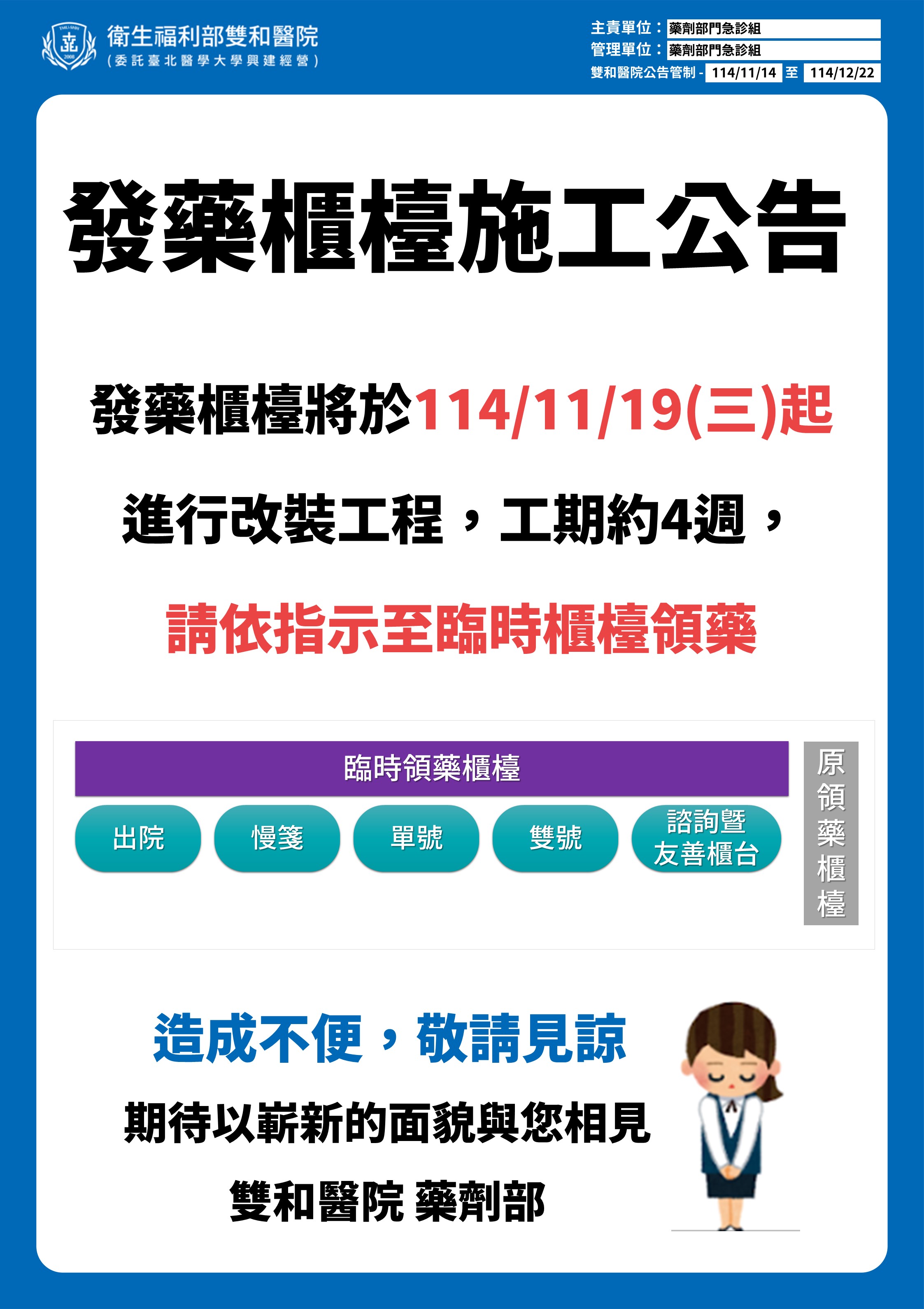 【重要公告】114.11.19起發藥櫃檯進行改裝工程 櫃檯異動公告