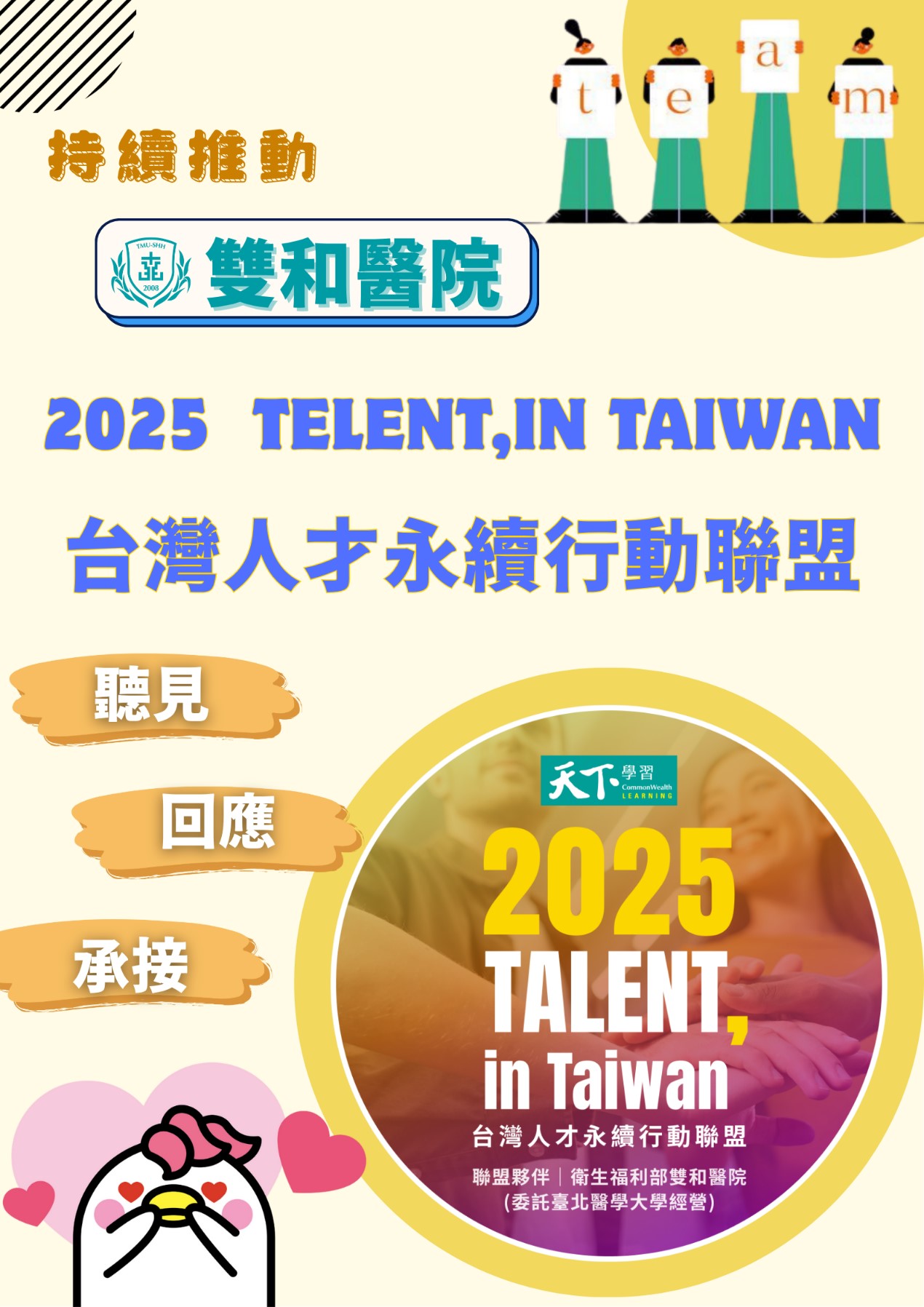 雙和醫院於 2023 年正式加入「TALENT, in Taiwan 台灣人才永續行動聯盟」,承諾從「意義與價值、多元與包容、組織溝通、獎酬激勵、身心健康與人才成長」等六大面向持續精進。2025 年本院再度簽署並延續該項人才永續倡議,透過制度優化與文化實踐,展現長期投入人才永續治理的決心,致力打造具競爭力且具歸屬感的醫療工作場域。