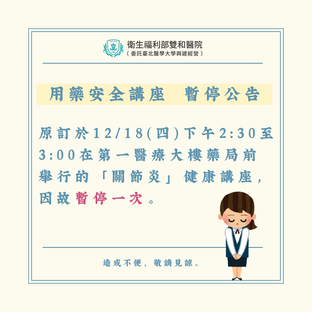 原訂於12/18(四)下午2:30至3:00在第一醫療大樓藥局前舉行的「關節炎」健康講座,因故暫停一次。